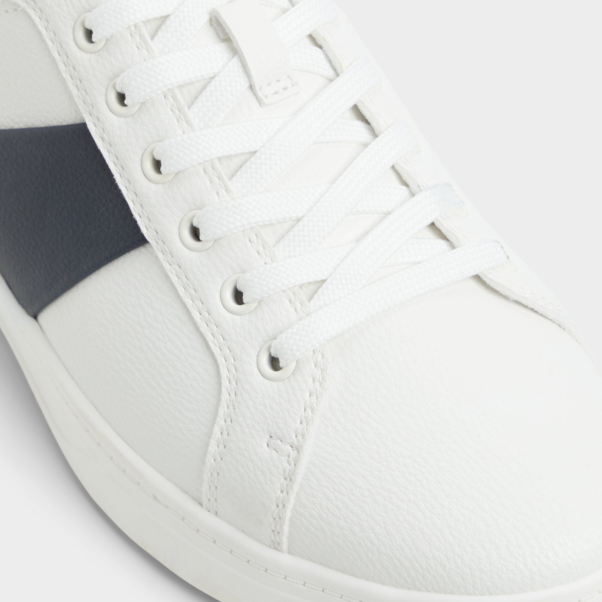 Navy panel cuts across smooth white synthetic leather, adding varsity energy, while metallic eyelets and a lightweight rubber sole keep these low-tops breathable from desk escapes to bar patios. Anchor slim chinos for brainstorm sessions or roll with faded denim on weekend brunch, the color-block stays sharp.