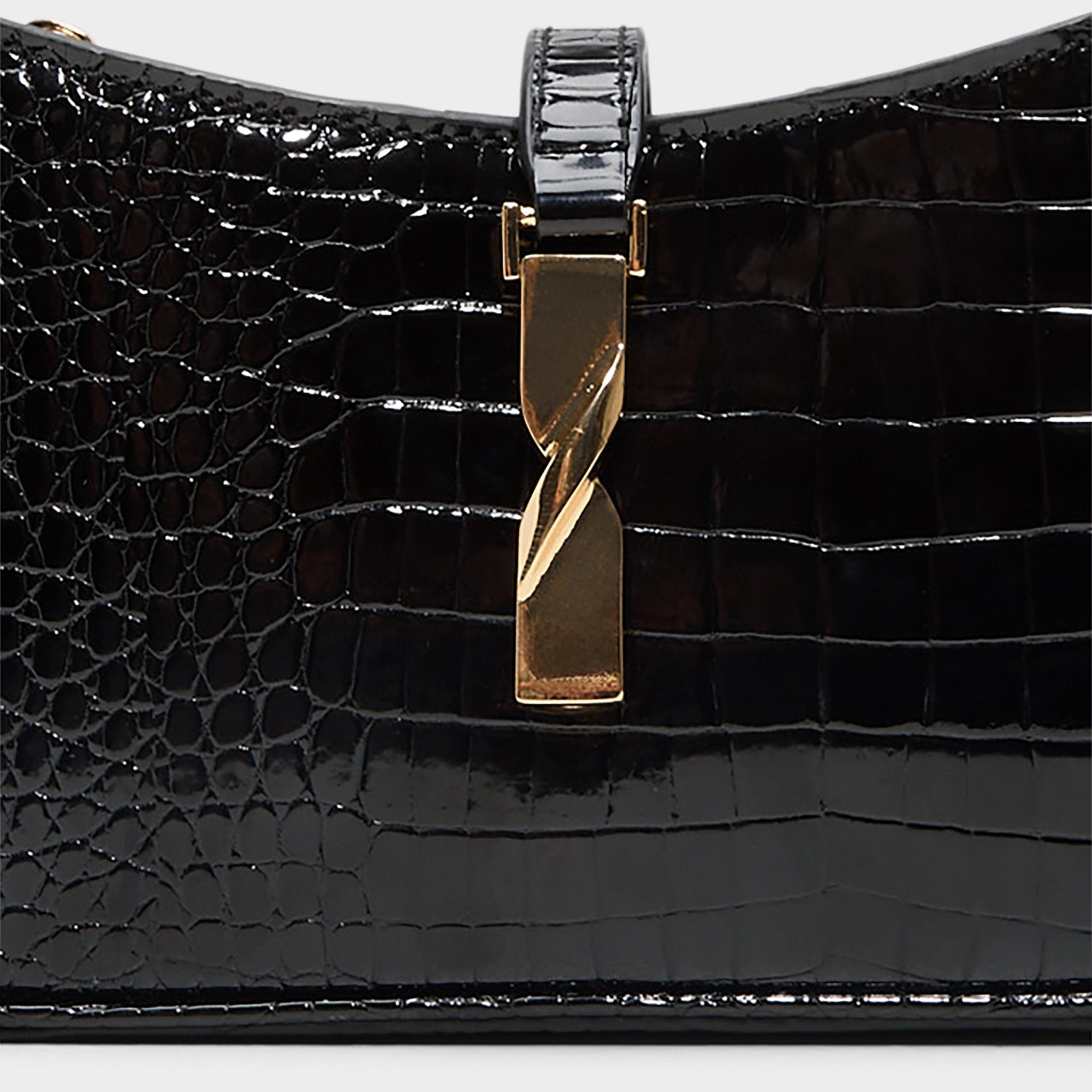 Glossy croc-embossed leather meets a sculptural gold push-lock, giving this sleek shoulder bag a confident silhouette, a sense of luxe polish, and a signature hardware moment. Tuck it against a silk slip for rooftop drinks, or carry it with a tailored blazer and denim for weekday dinners.