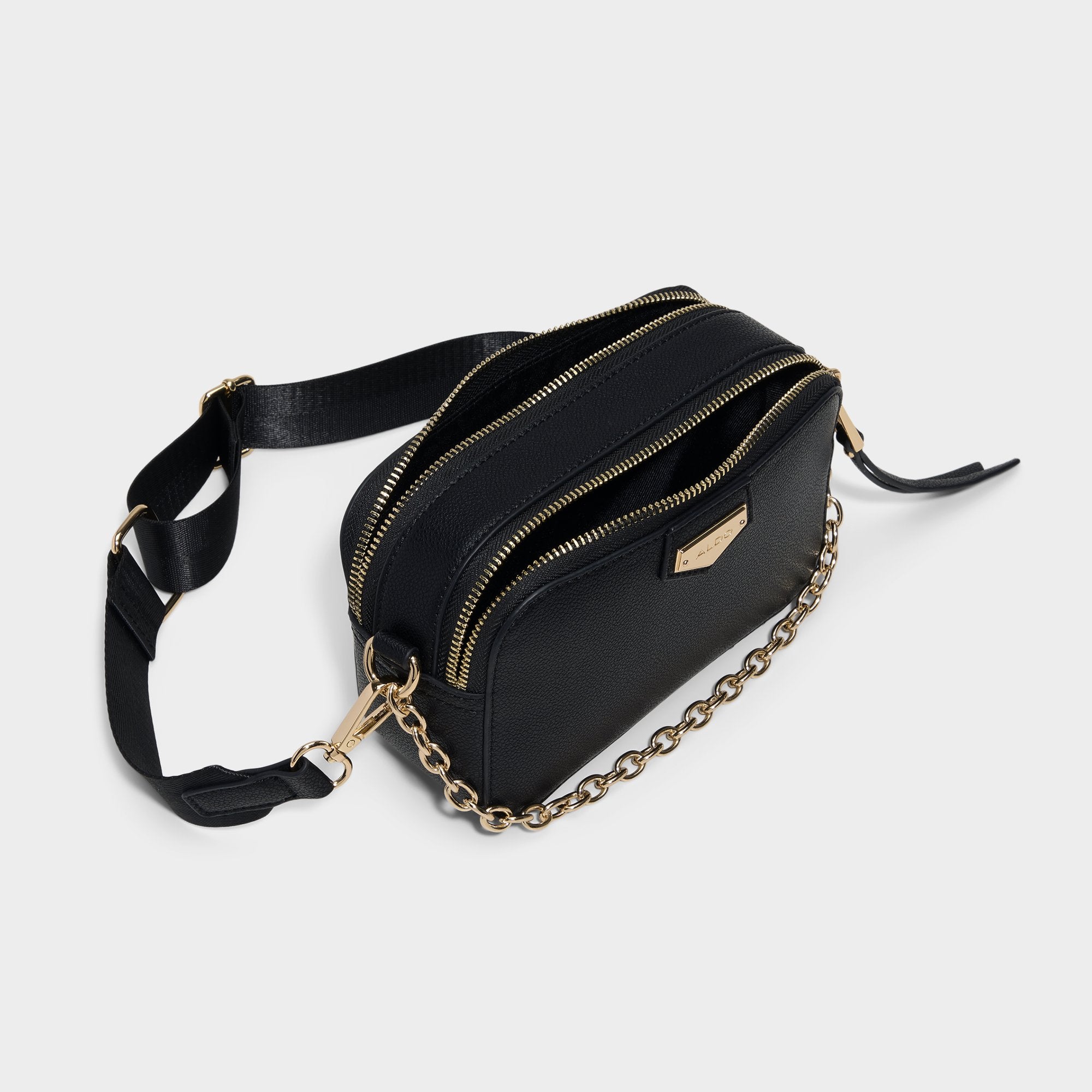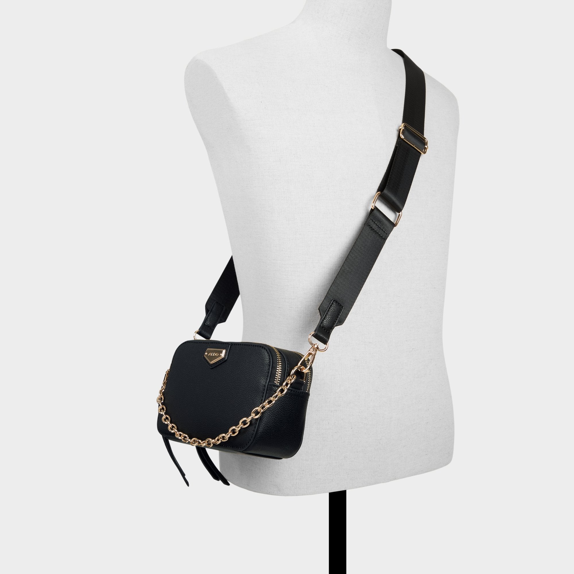 Swap-friendly twin straps-one laid-back webbing, one glinting chain-give this sleek leather crossbody chameleon status, plus a top-zip locks down essentials as the compact camera silhouette tucks neatly against you. Sling it across cargo pants for coffee runs or clip on the chain with a slip dress for after-dark ease.