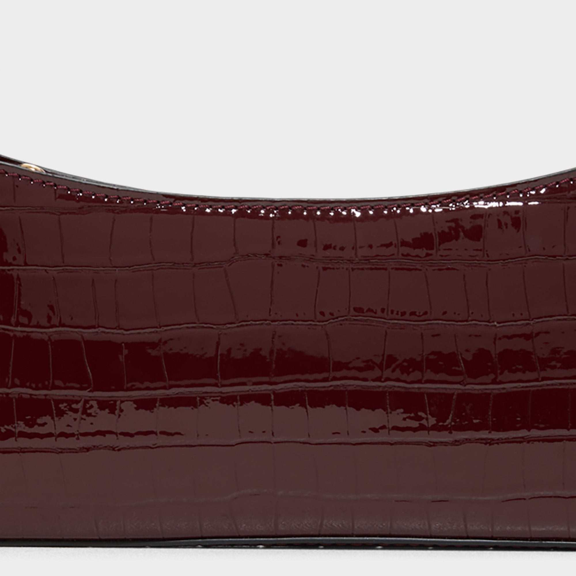 Glossy burgundy croc-embossed leather shimmers over this slim shoulder baguette, delivering after-dark confidence with a gold-tone zip and an adjustable strap for a truly wearable touch of luxe. Carry it with a satin slip for rooftop drinks or sling it over jeans for gallery afternoons, finishing looks with discreet polish.