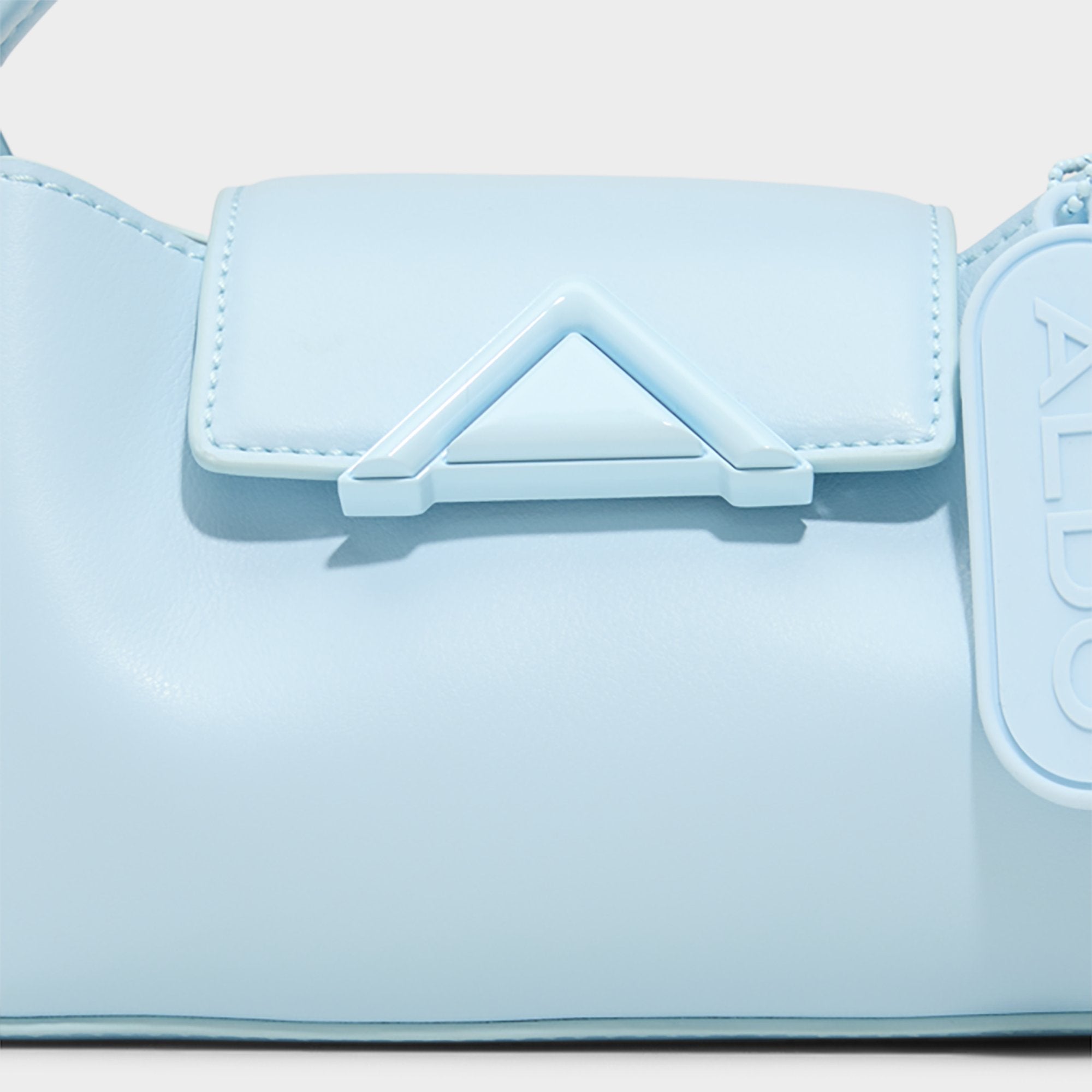 Sculpted in ice-blue matte finish, this trapeze mini bag channels modern-art vibes with a wide curved handle and a tonal triangle buckle, delivering city-ready polish without shouting for attention. Carry it with a slip dress for gallery days, or tuck it under an oversized blazer for drinks after dark.