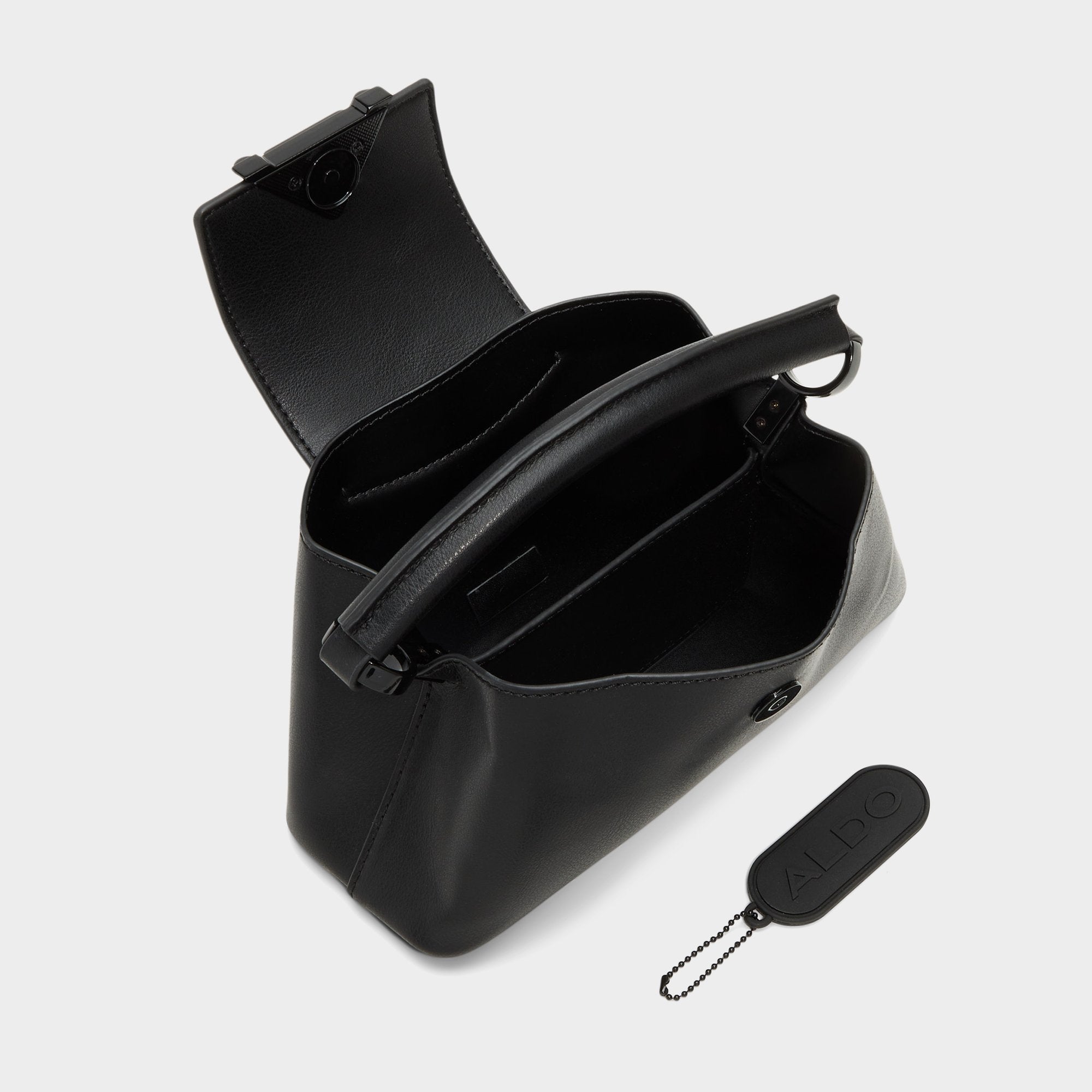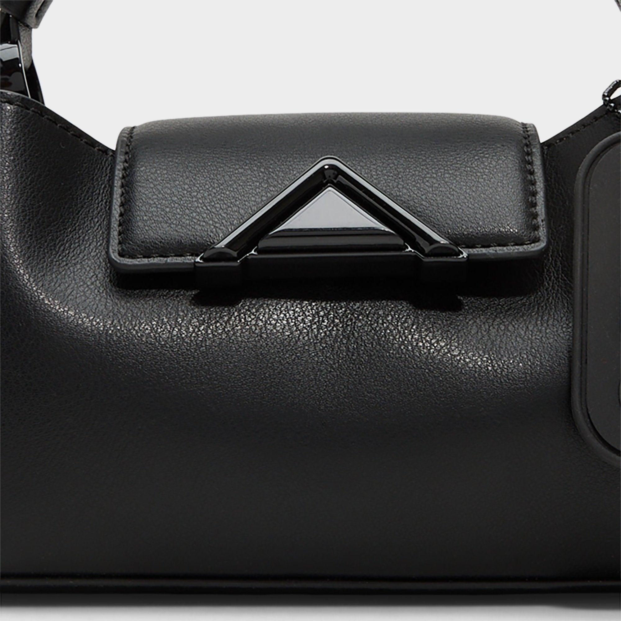 Midnight tones sharpen this mini top-handle, where smooth faux leather meets triangle hardware and a snap flap keeps essentials secure through late-night detours. Carry it with a satin slip for rooftop dates or tuck it under a blazer at coffee runs, pulling any look together.