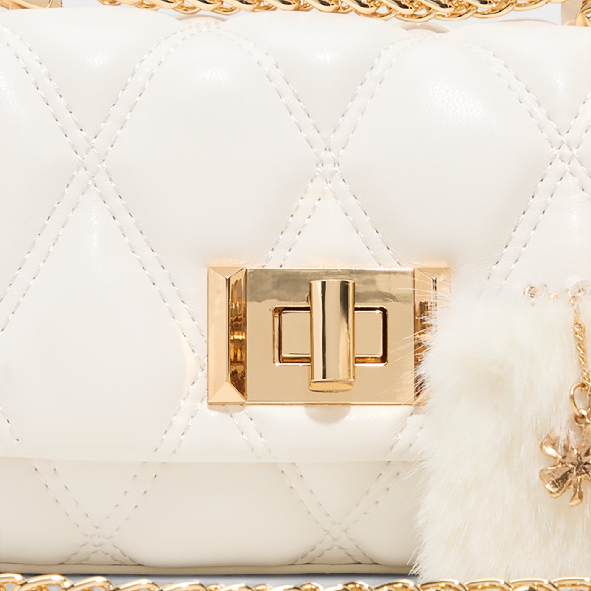Diamond-quilted leather glows against polished gold hardware, while a plush faux-fur charm adds a playful wink to the secure turn-lock, turning this crossbody into city-chic polish for days that move from meetings to moonlit pops. Carry it with satin slip dresses at dinners or sling it over oversized knits for casual coffee runs.