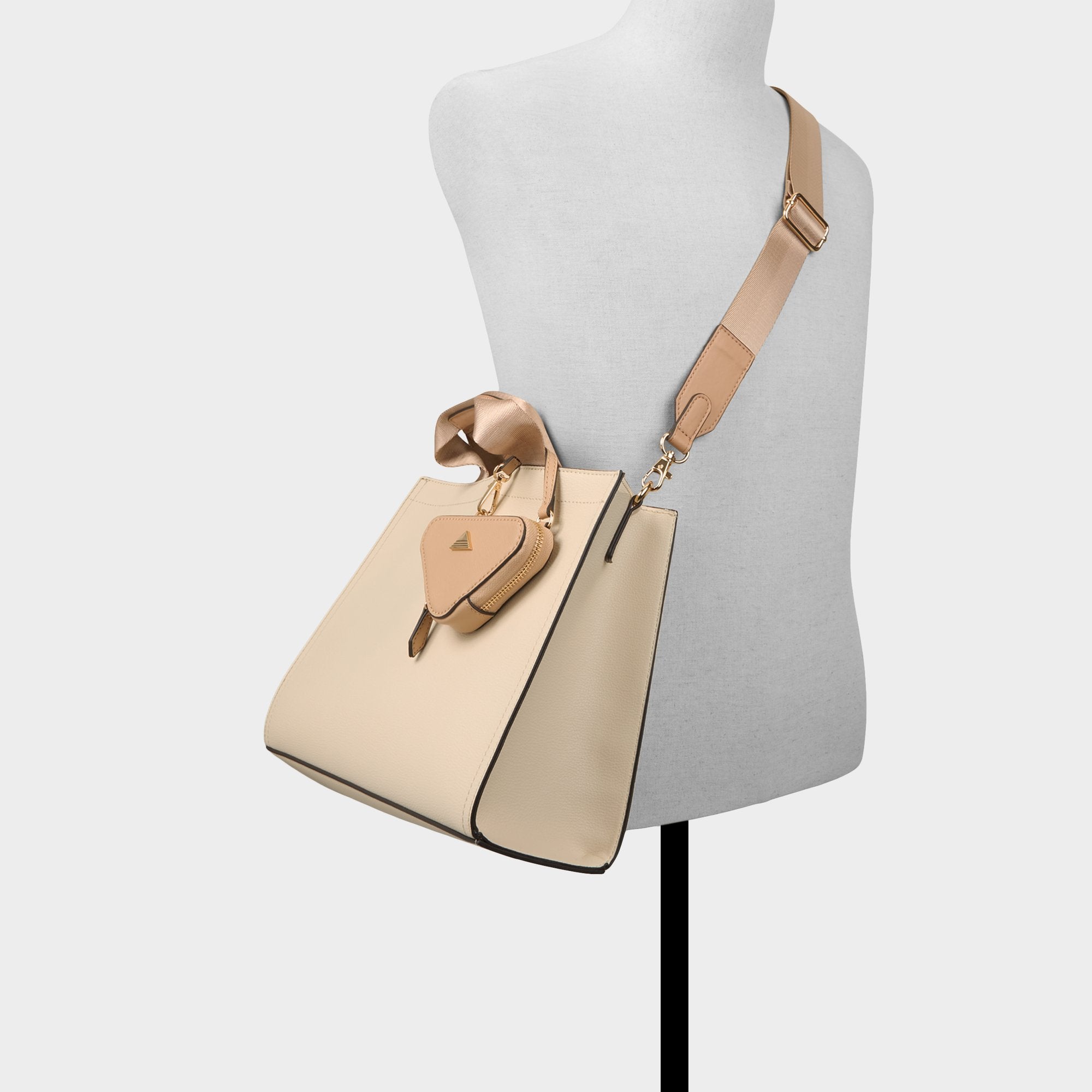 Sculpted edges frame beige panels, pairing architectural lines with glinting hardware for city-ready confidence, while dual top-handlings and adjustable straps switch from arm-carry to shoulder mode in a snap for campus to cocktails. Carry it with tailored trousers or sling it over a sundress, finishing looks from class to weekend socials.