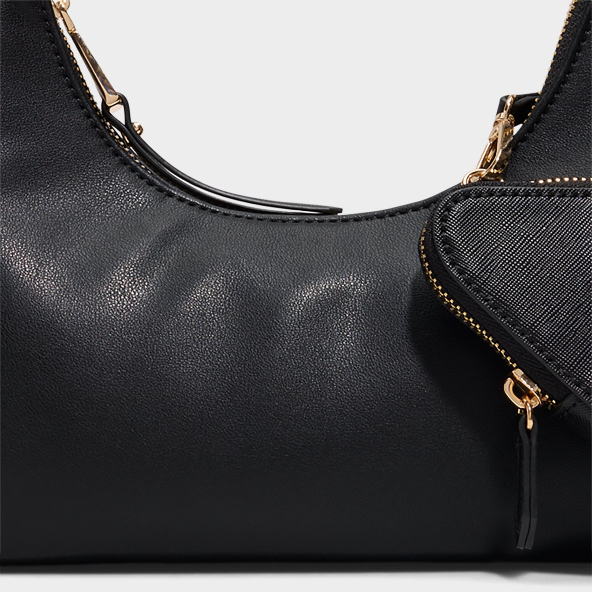 A triangle mini pouch clips off in a snap, adding playful utility to this sleek leather shoulder bag, with sculpted gold-tone chains tracing the strap and zipper for polished moves. Carry it with a blazer and wide-leg trousers for office catch-ups, or sling it over a slip dress on late-night plans to complete the look.