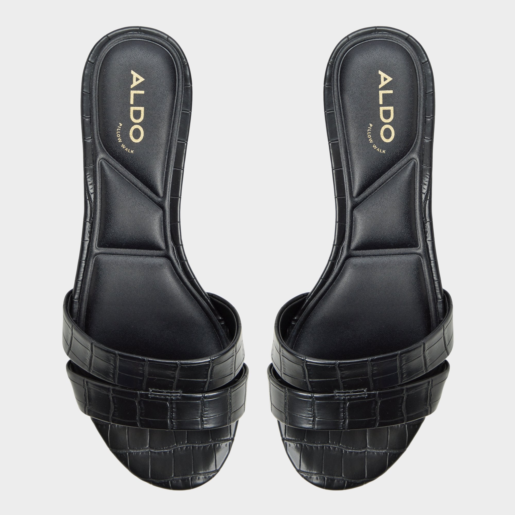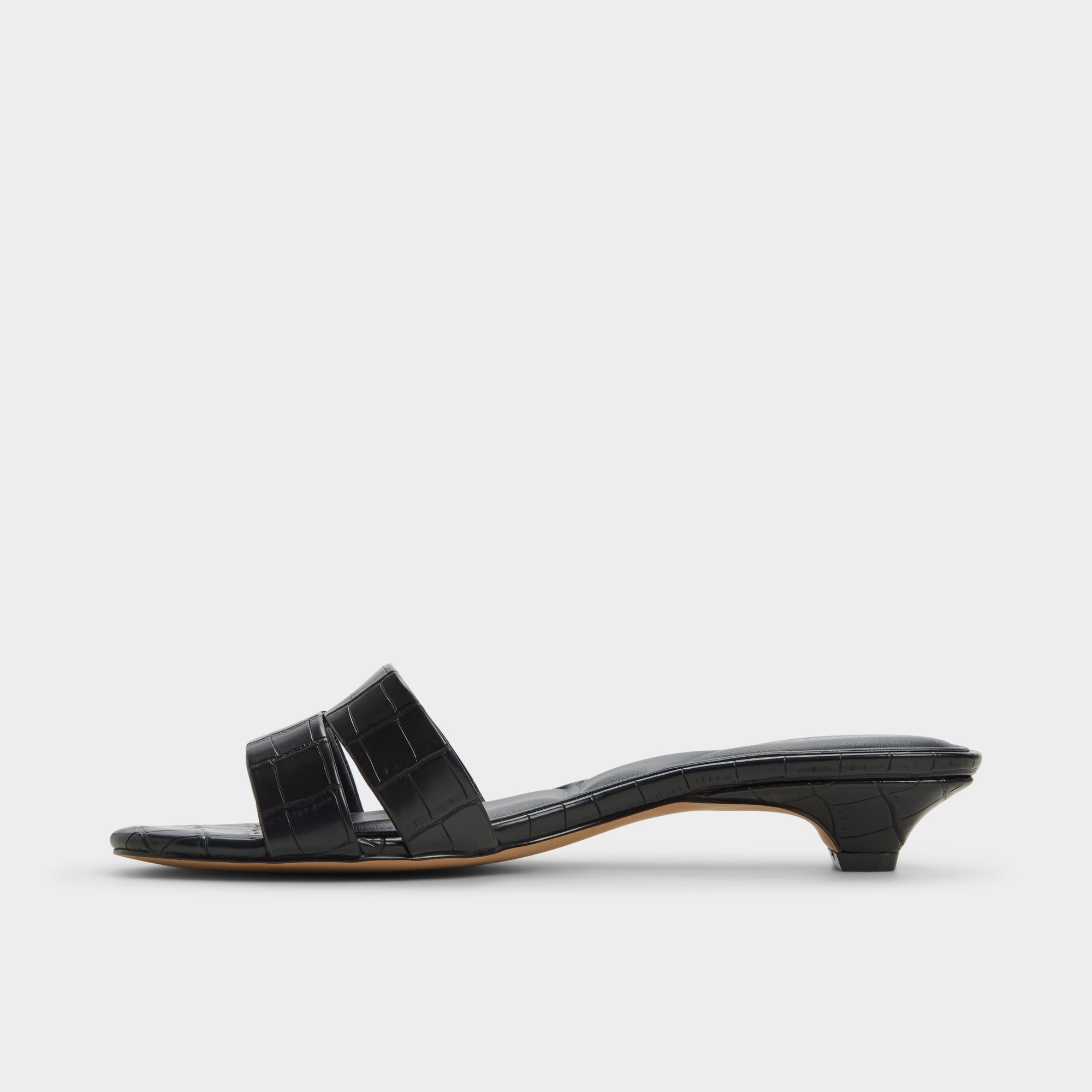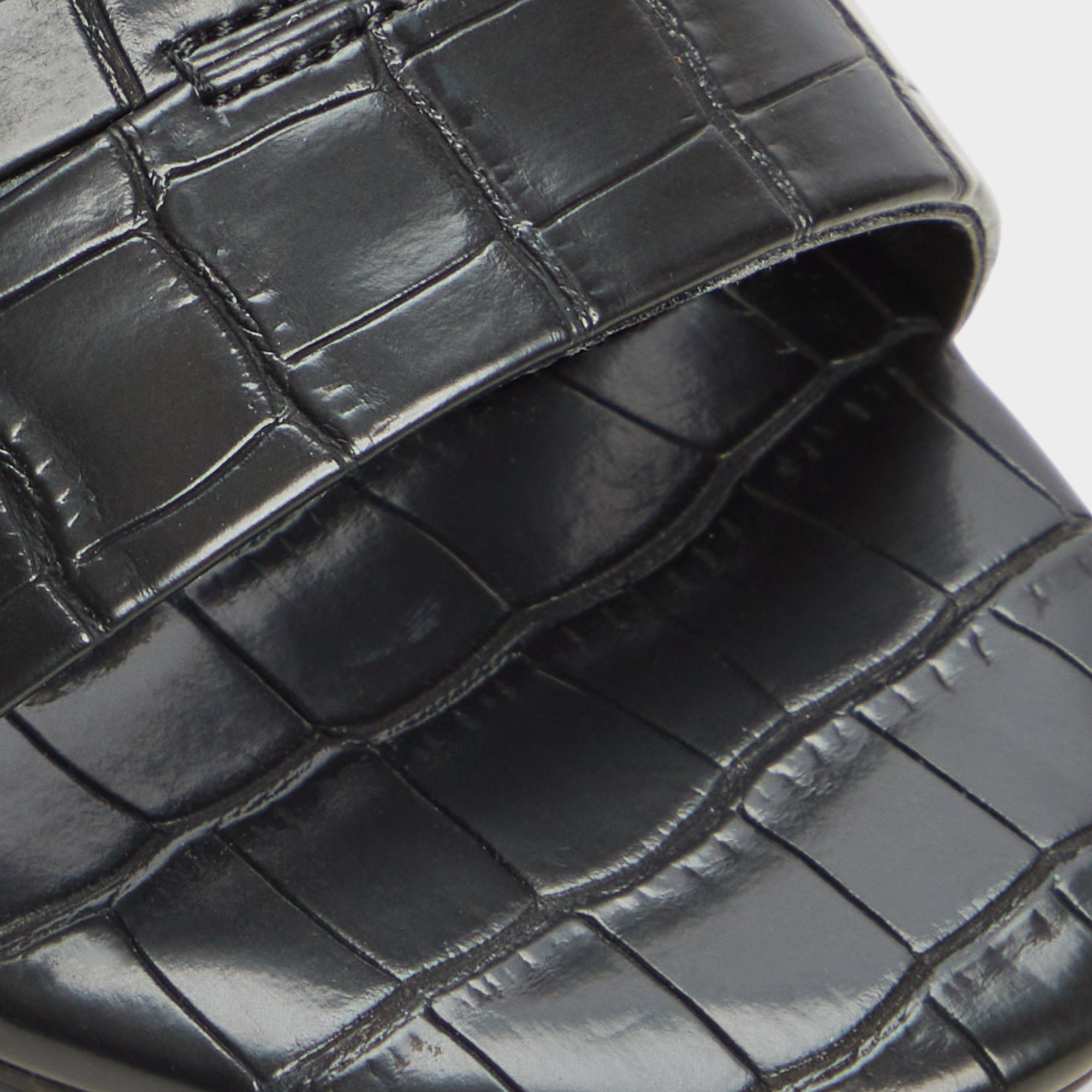 Glossy croc-embossed leather shapes this sleek slide, with a kitten heel and square footbed delivering discreet lift for city errands or poolside downtime, a touch of shine that stays refined. Pair with tailored shorts for gallery afternoons, or slide under a satin midi as rooftop cocktails melt into slow dancing.