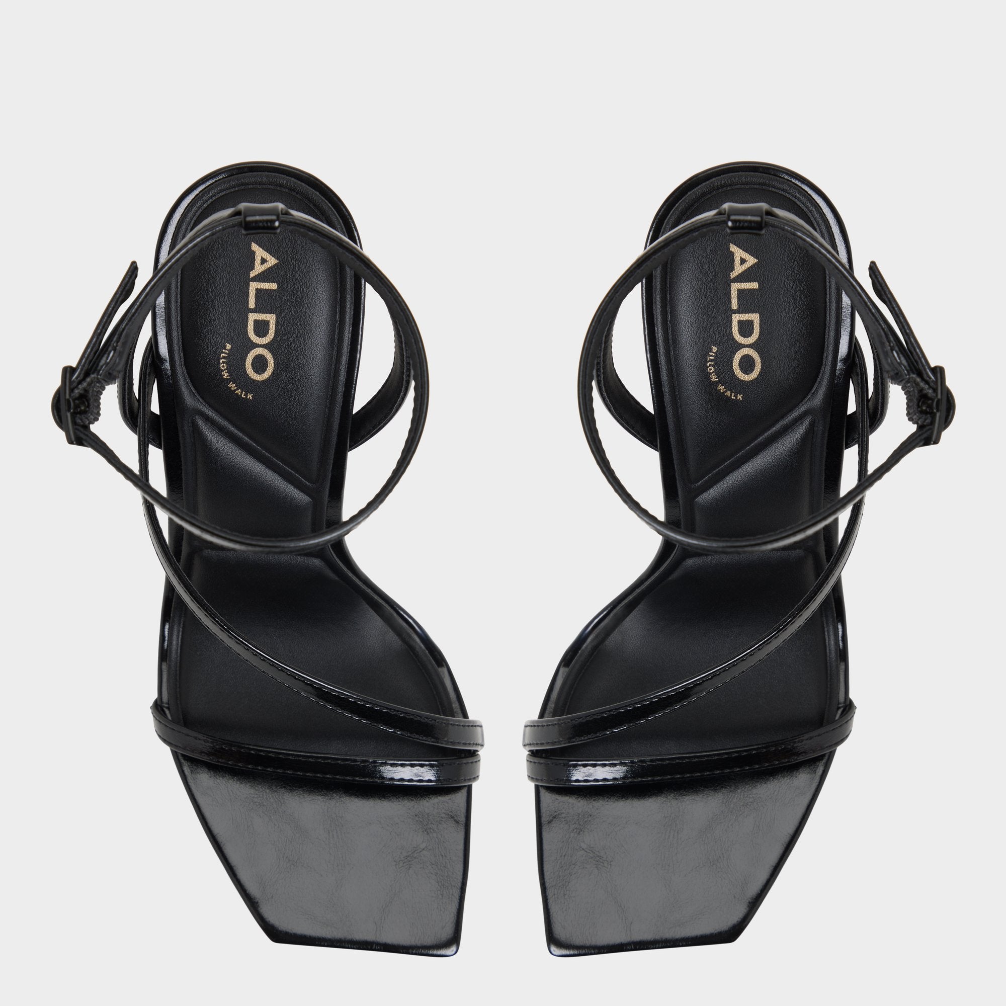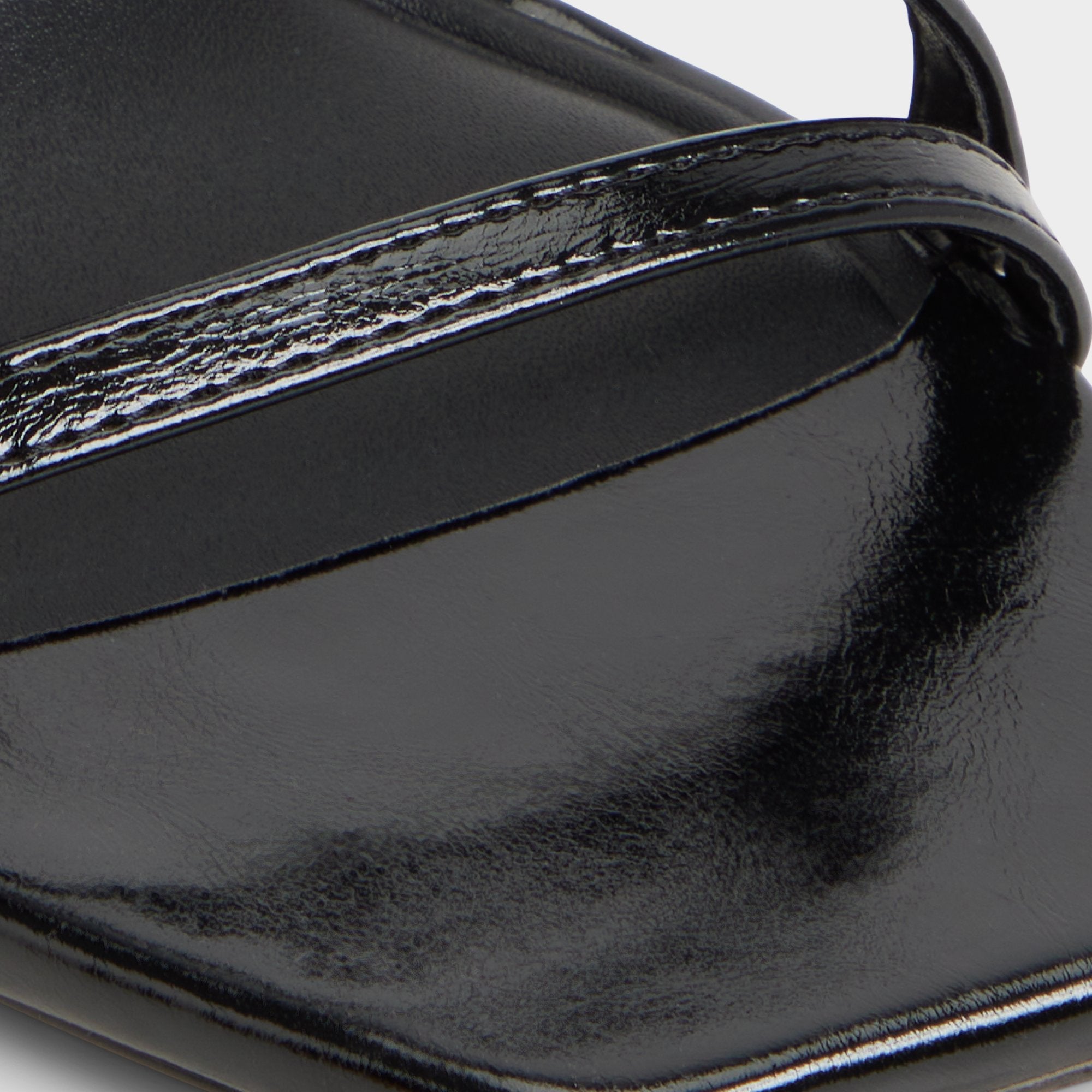 Glossy jet-black leather forms barely-there straps over your foot as a sleek stiletto lifts the square toe on plush padding-ideal from nightclub confidence to cab comfort. Combine with a satin slip for rooftop toastings or swap in tailored shorts when brunch extends into art openings.