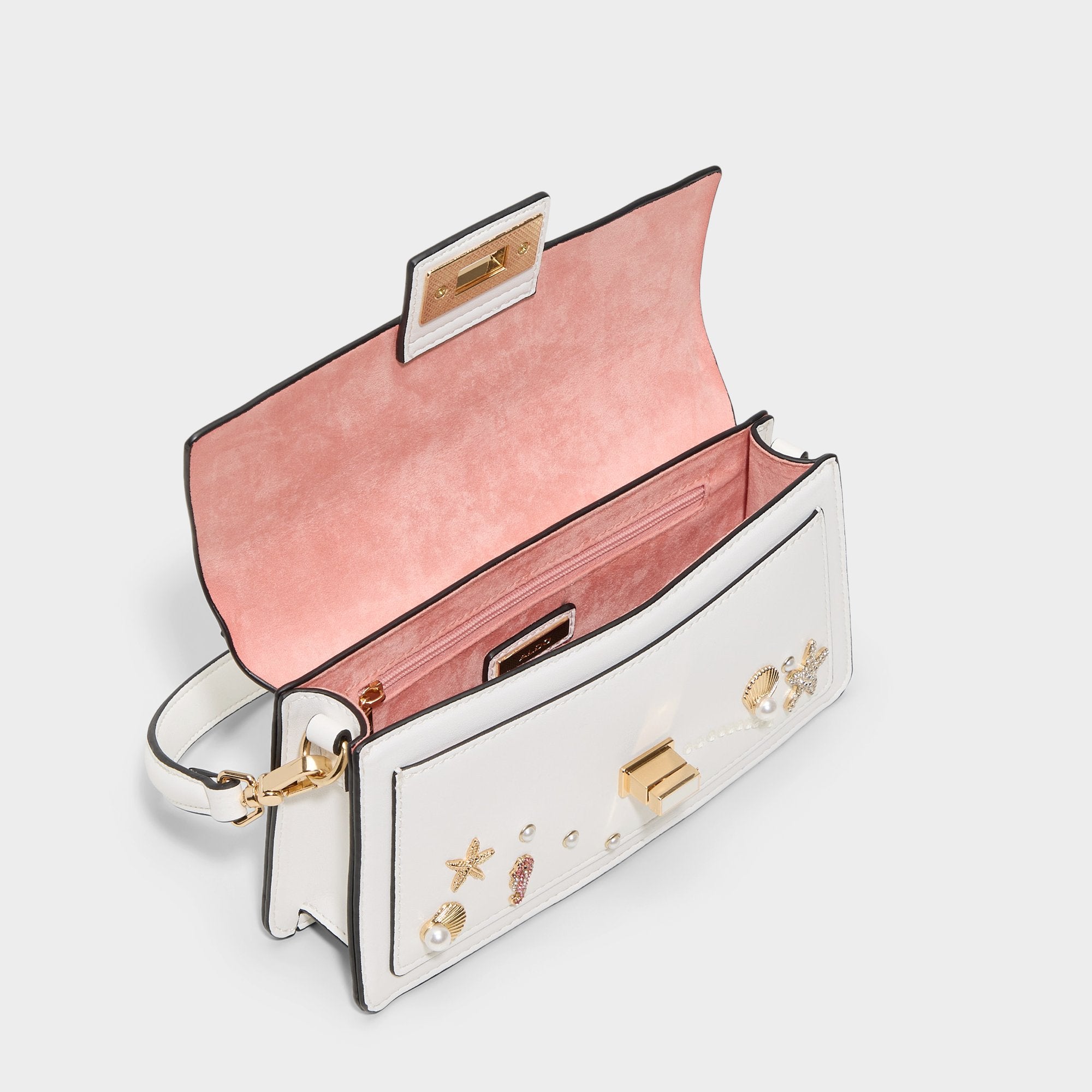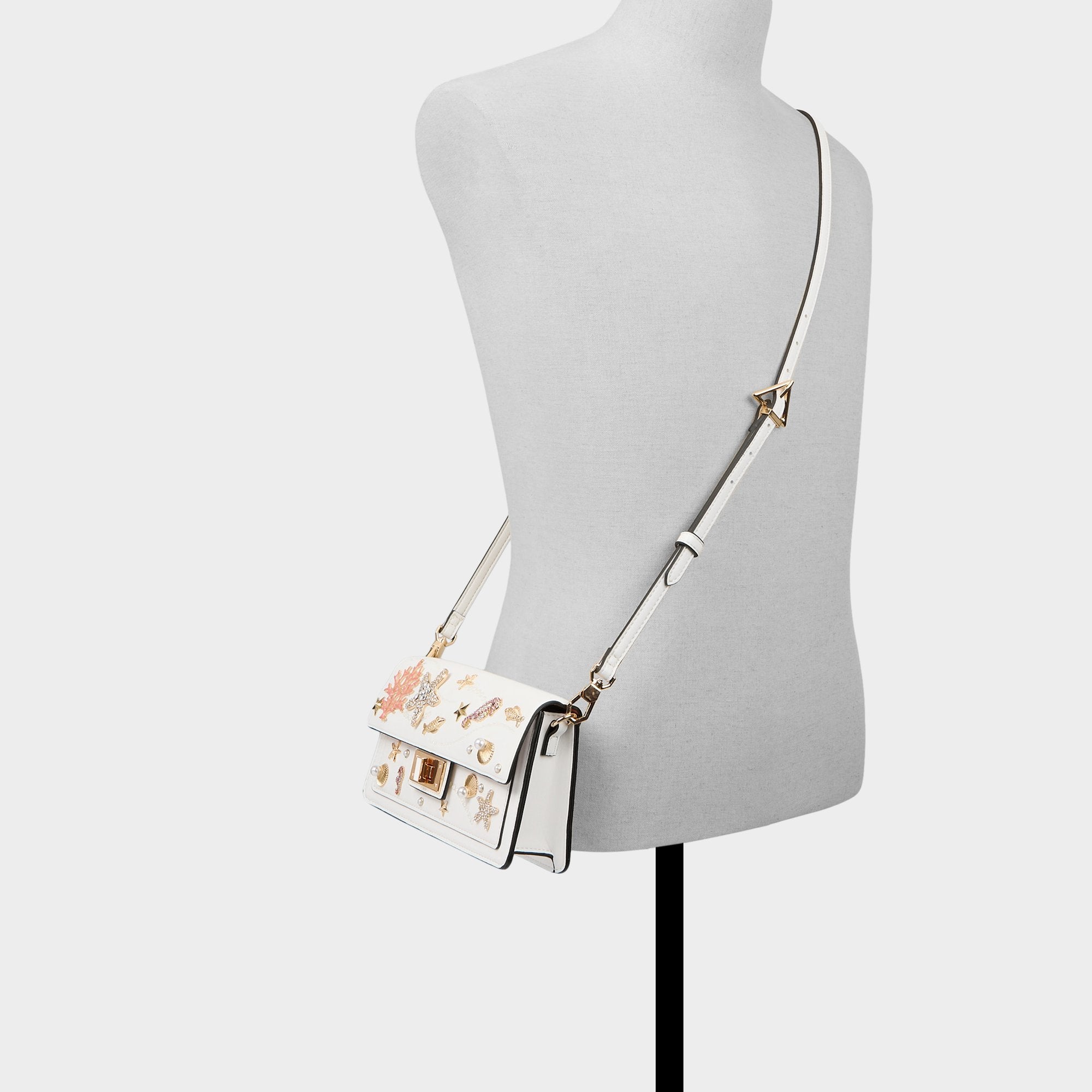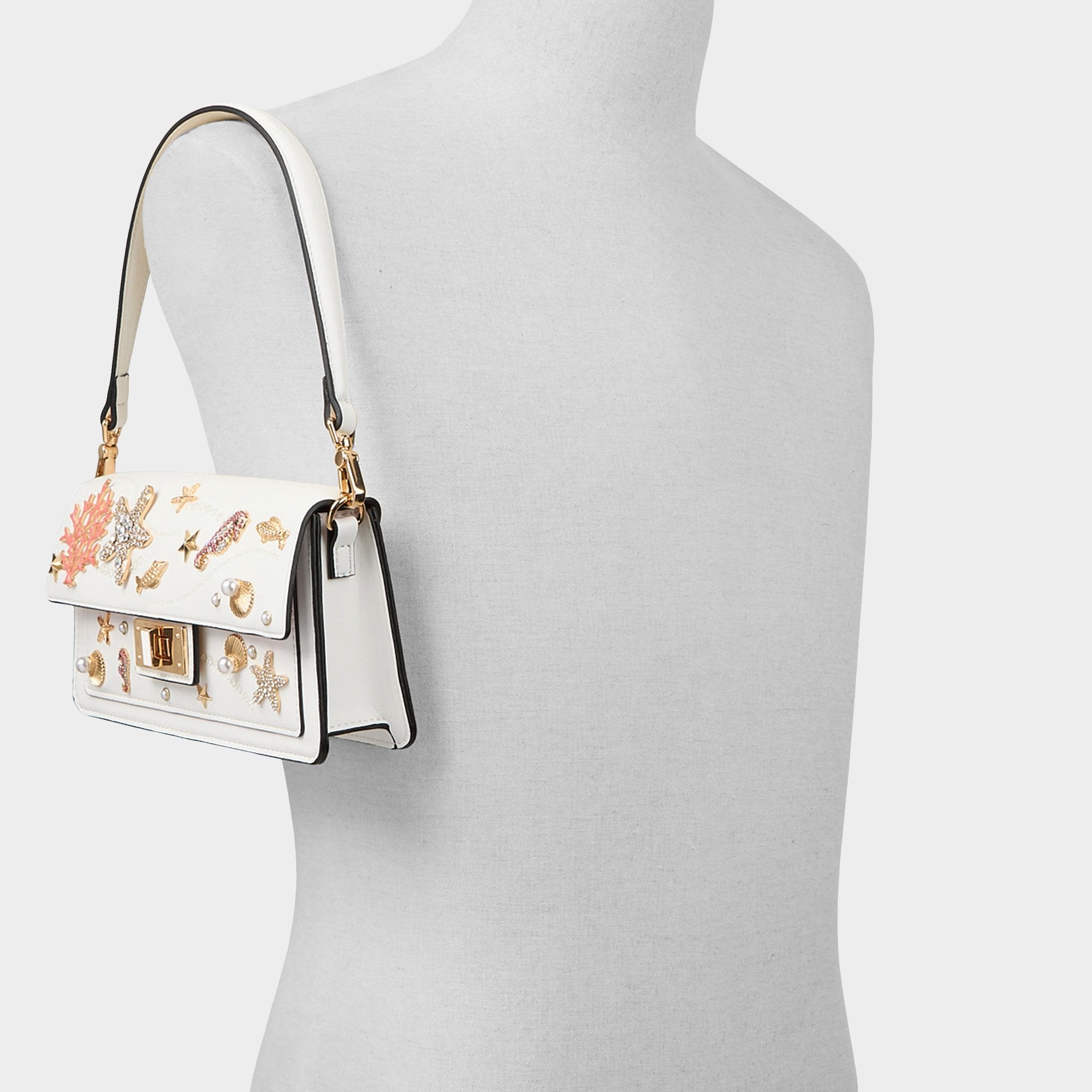 Pearl-dotted seashells, coral pops, and a crystal starfish drift across creamy leather, but the real trick is the clip-off shoulder strap that lets the slim silhouette switch from laid-back drape to hand-held treasure in seconds. Sling it over a linen blazer for rooftop brunches, or tuck it under a satin slip at evening weddings to finish with coastal sparkle.