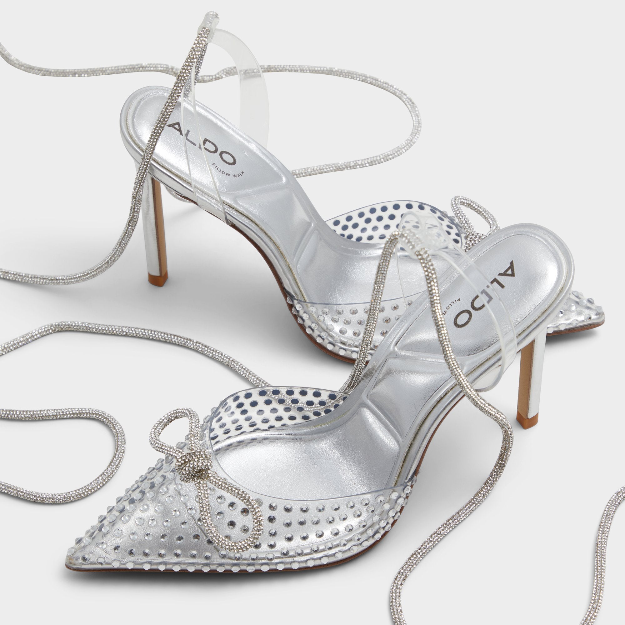 Bow accent, rhinestone embellishments, lucide detailing and more. These strappy stiletto heels are simply too stunning not to wear out!