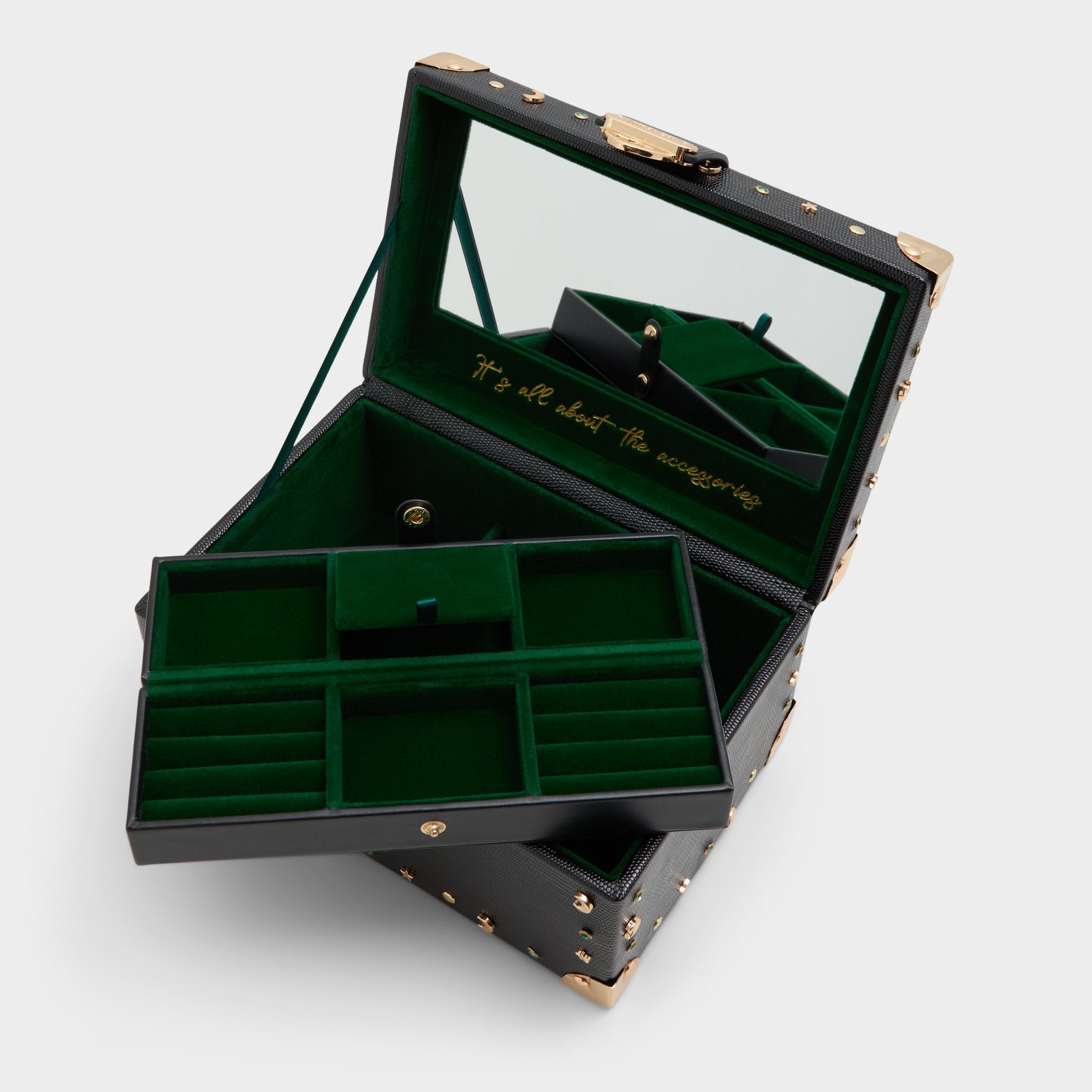 The perfect piece for storing all of your bewitching charms. Discover this limited-edition jewelry box inspired by Elphaba. Featuring black exterior with gold and emerald detailing, this piece is finished inside with a full-size mirror and green velvet cushioning.