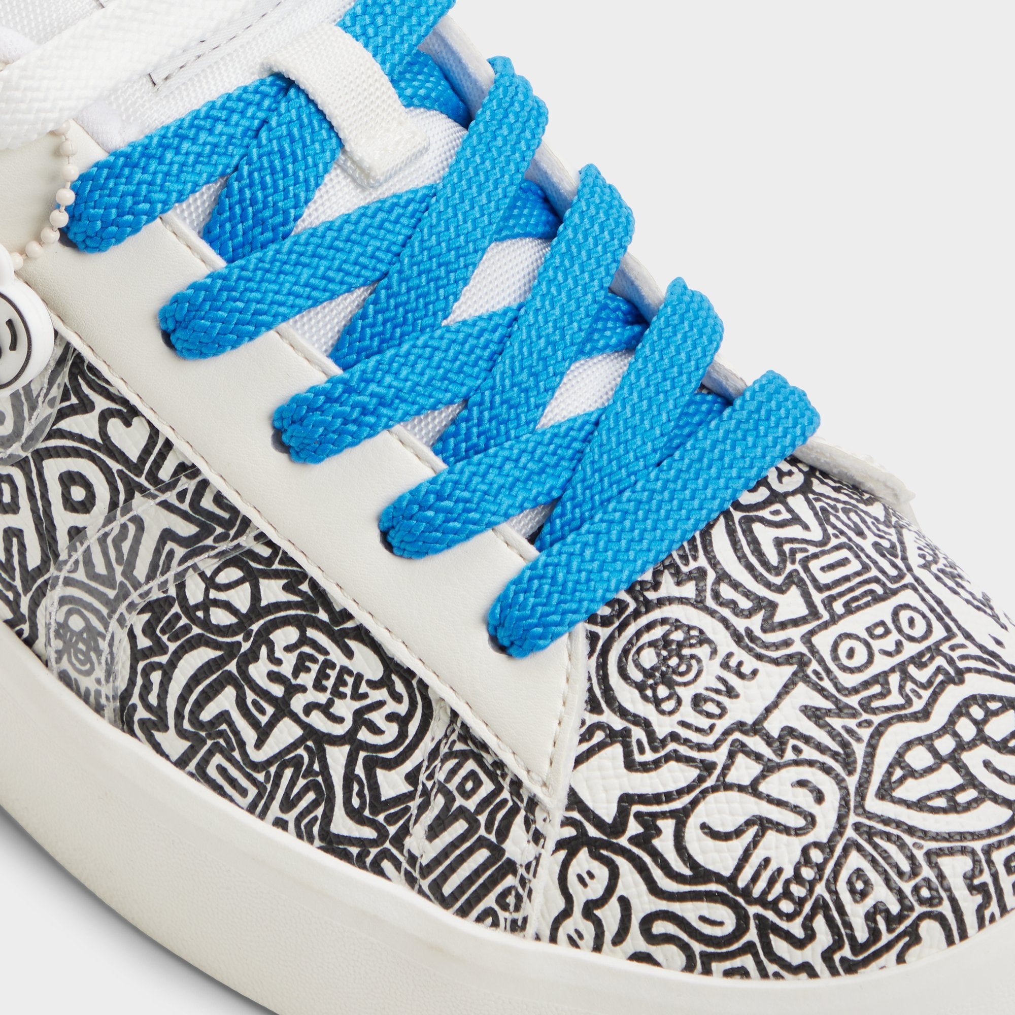Street-art doodles bloom across buttery leather, blue laces popping against a cushioned sole that keeps every stride confident as you chase detours and second coffees through the city streets, stations, and sunny plazas. Pair with cropped denim for brunch runs, or slip under a floaty midi as gallery nights turn into sidewalk soirees.