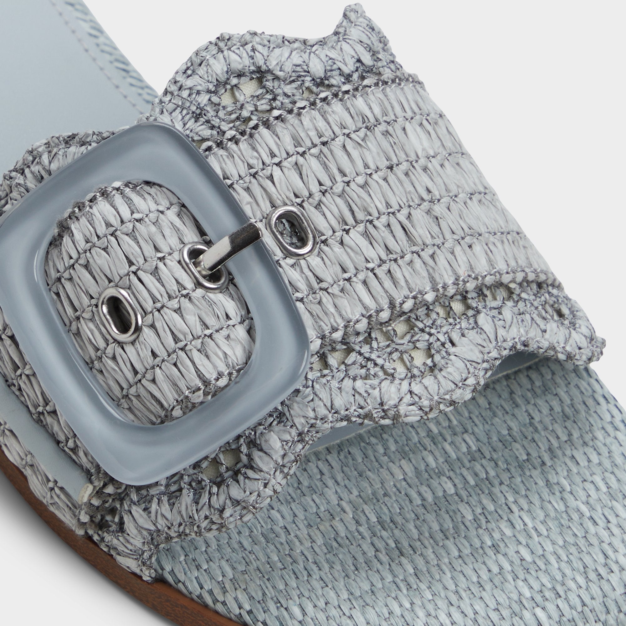Sky-blue raffia wraps a breezy slide, crowned by an oversized buckle and a cushioned footbed that keeps every sidewalk dash feeling grounded and polished. Pair cropped denim for brunch hops, or slip beneath a gauzy midi when sunset picnics drift toward spontaneous boardwalk strolls, letting this easy, sun-ready slide do the heavy lifting.